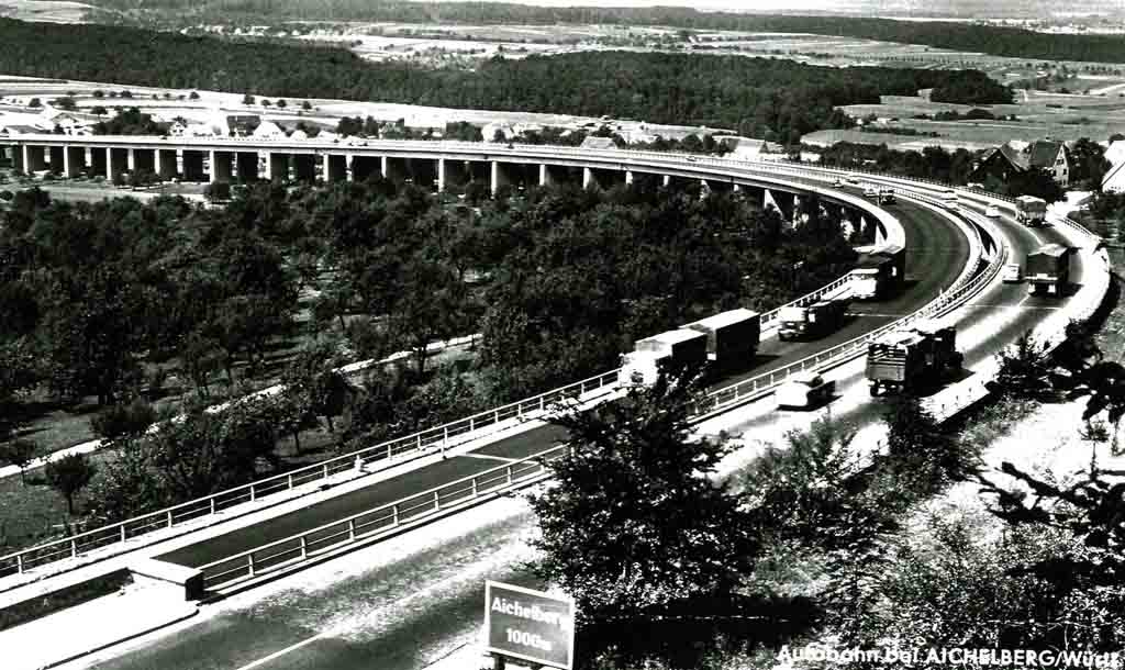 Dies ist eine Aufnahme vom Albaufstieg aus dem Jahr 1955. Nachdem die gesprengten Abschnitte des Aichelbergviaduktes 1951 wieder aufgebaut waren, konnte der stetig zunehmende Verkehr wieder rollen.