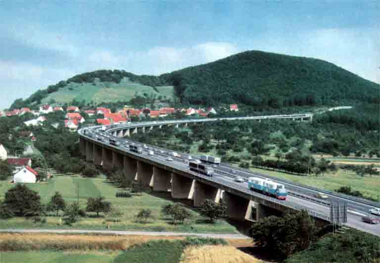 Eine Ansichtskarte des Viadukts aus den frühen 80er Jahren. Schön zu sehen, die Verkehrsschilder: Überholverbot für LKW (über 4t) und Höchstgeschwindigkeit 50 Km/h. (wie aktuell noch am Drackensteiner Hang)