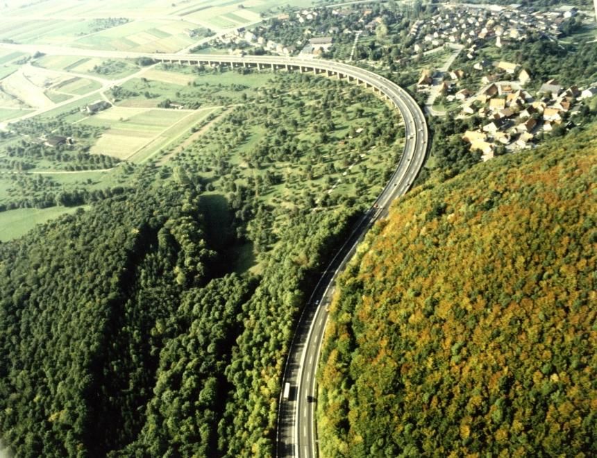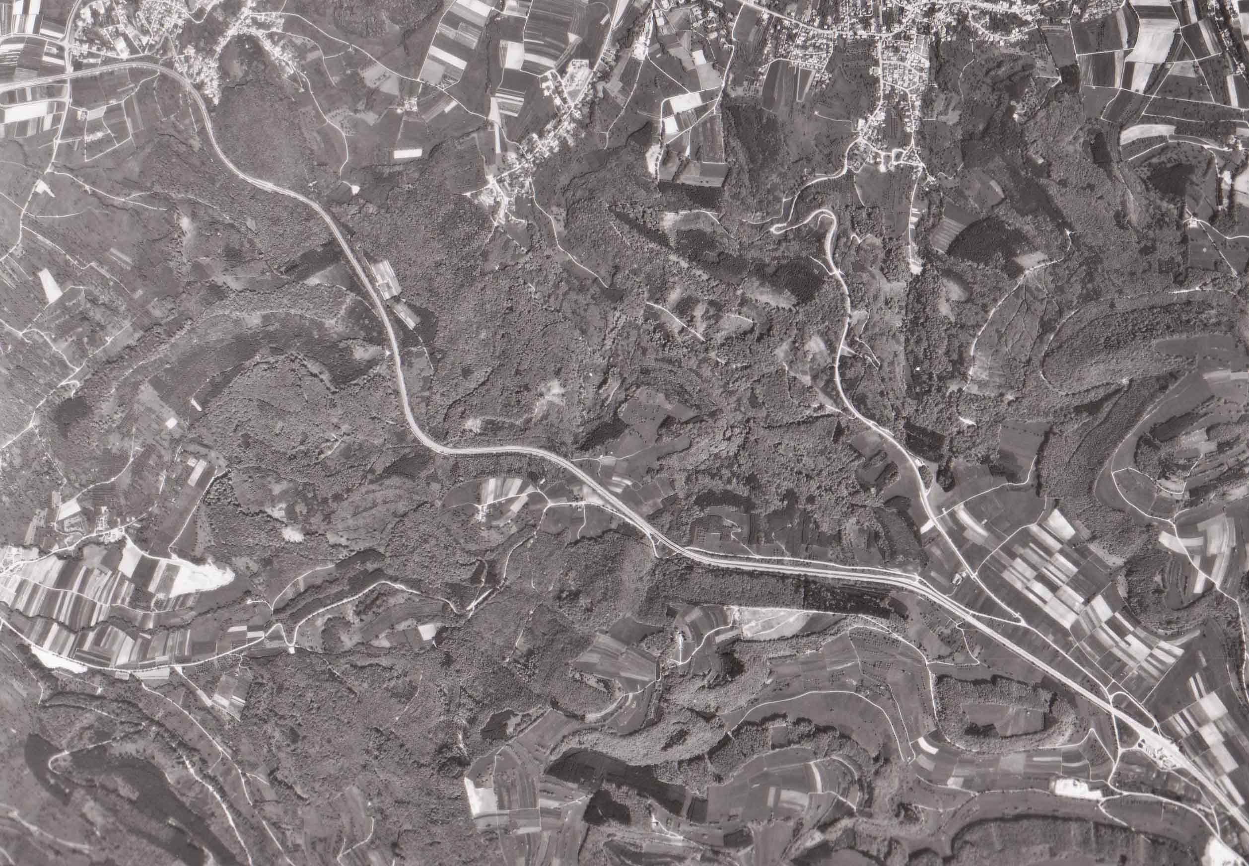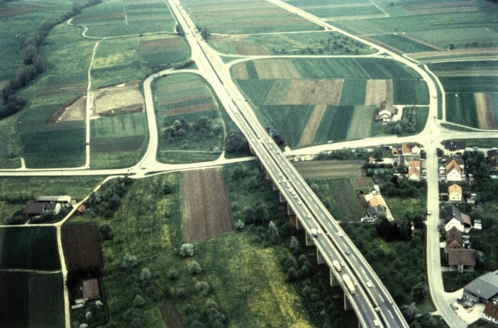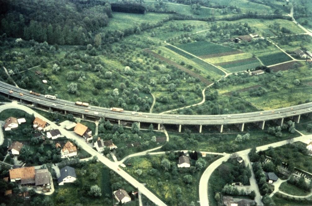 Eine Ansicht der alten Franzosenbrücke im August 1990. Diese ist hier nicht mehr unter Verkehr, da bereits im Juli '90 die neue Trasse auf einer Fahrtrichtung befahren wurde. Zu erkennen sind die Stützvorrichtungen, mit denen die altersschwache Bücke gestützt werden mußte. Luftbild von 1981 Dieses Luftbild des Landesvermessungsamtes Baden-Württemberg zeigt die Autobahn zwischen Aichelberg und der Raststätte Gruibingen im Jahr 1981.